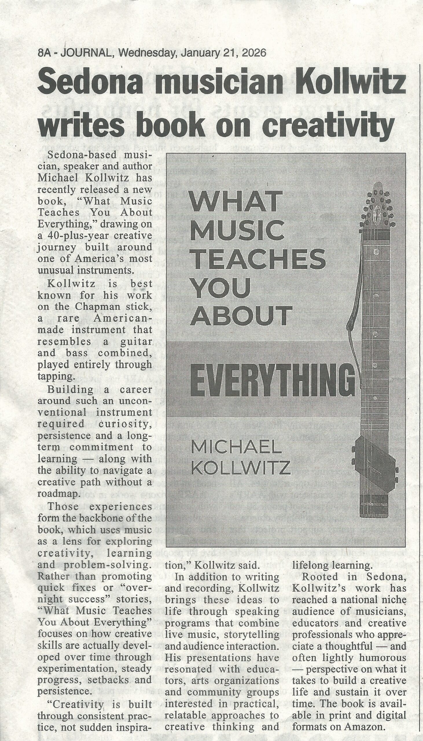 Local Press for New Book February 1, 2026February 1, 2026 This was a nice surprise to see in print. Thanks to the Cottonwood Journal for featuring my book and for supporting local artists and writers. chapman stick, michael kollwitz, What Music Teaches You About Everything Books, Reviews